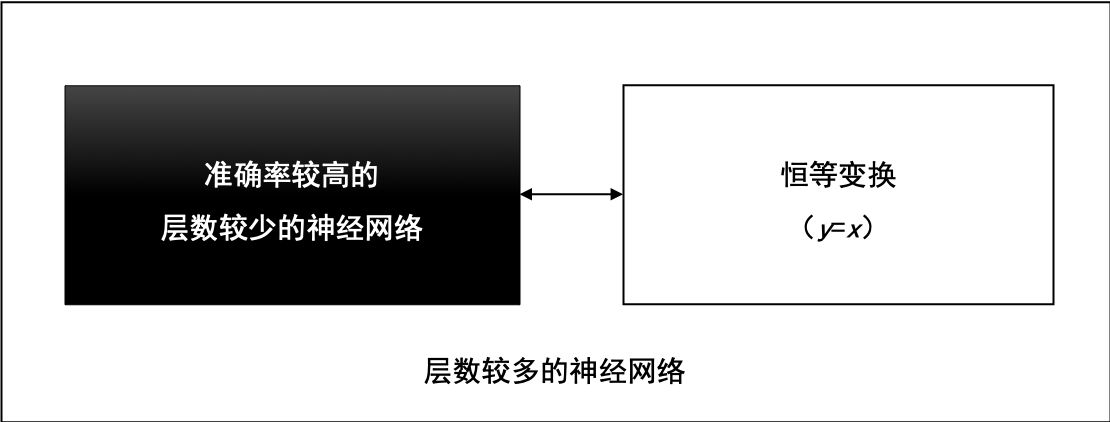 假设一个层数较少的神经网络已经达到了较高准确率,我们可以在这个神经网络之后,拼接一段恒等变换的网络层,这些恒等变换的网络层对输入数据不做任何转换,直接返回(y=x),就能得到一个深度较大的神经网络,并且,这个深度较大的神经网络的准确率等于拼接之前的神经网络准确率,准确率没有理由降低。