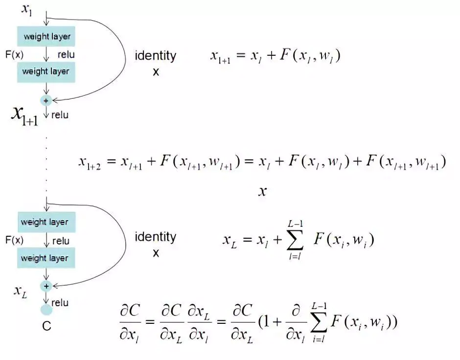 ResNet最终更新某一个节点的参数时,由于h(x)=F(x)+x,由于链式求导后的结果如图所示,不管括号内右边部分的求导参数有多小,因为左边的1的存在,并且将原来的链式求导中的连乘变成了连加状态(正是 ),都能保证该节点参数更新不会发生梯度消失或梯度爆炸现象。