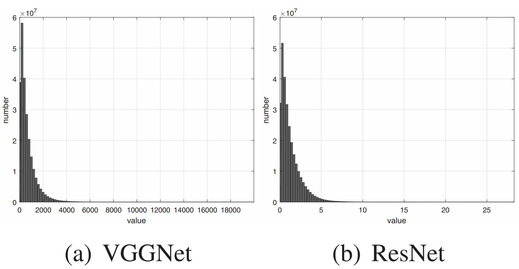 实际上,大部分的神经网络特征图数值都遵循正态分布或是指数分布。
