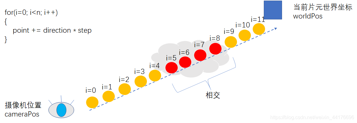 ray marching 算法从摄像机开始,向世界空间投射光线,并且逐步行进,记录沿途的信息。比如我们沿途不断判断当前点是否在云层中,如果沿途至少有一点在云层中,我们认为视线和云层相交。下图描述了 ray marching 算法的步进过程: