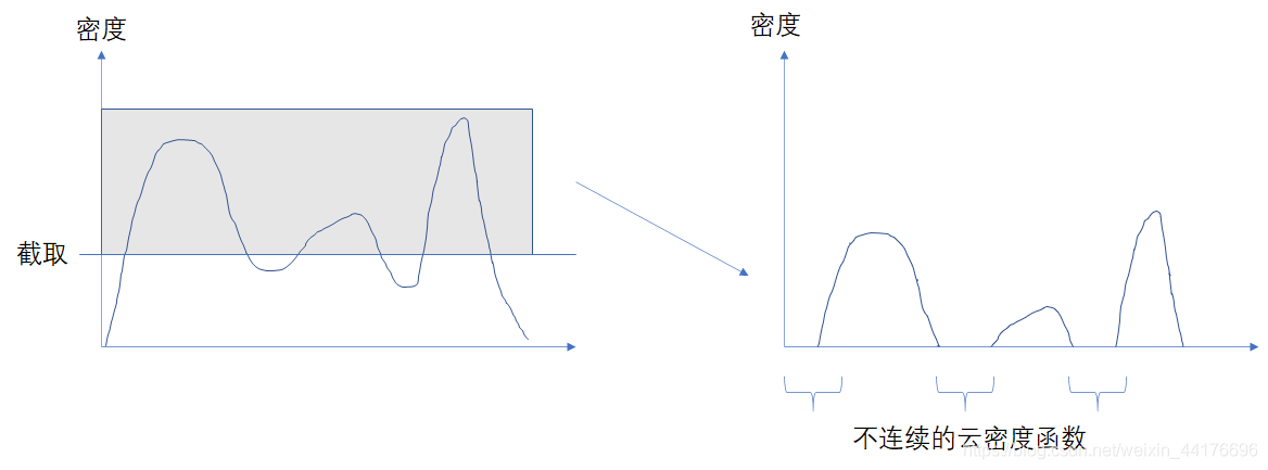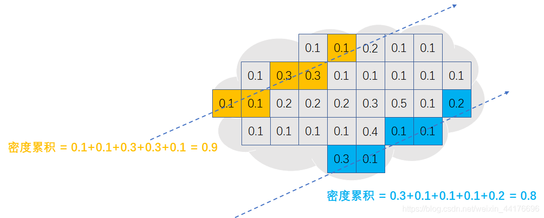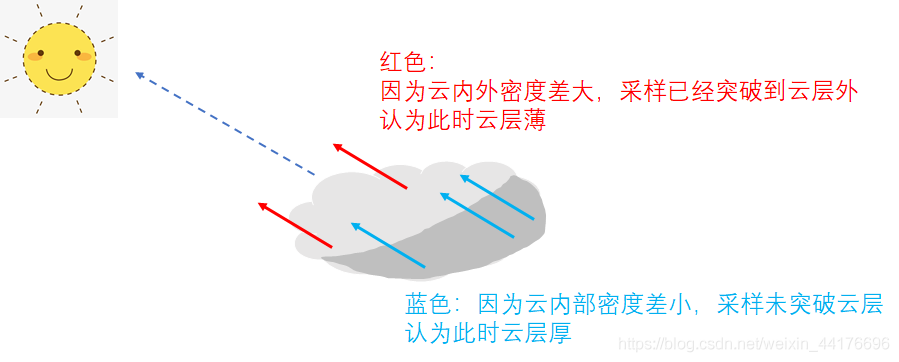 以上的思路是针对具有明确边界的【固体】进行的,但是云朵通常是用一种没有具体边界的【密度函数】来描述的。密度函数的输入是三维的坐标,输出是当前坐标的云朵的密度。于是每次采样我们累积云朵的密度,就可以知道当前光线穿越了多厚的云。二维下的算法图示如下: