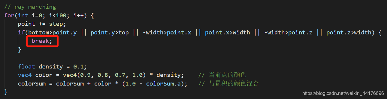 首先朝视线方向 direction 投射光线,然后沿途记录光线是否在指定的盒子中,如果在,那么我们积累颜色,并且进行颜色混合。注意这里我们的 ray marching 是 从摄像机出发 ,在代公式的时候我们要注意: