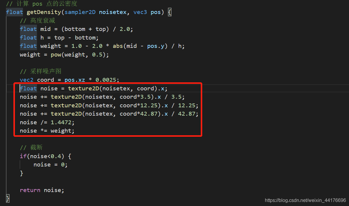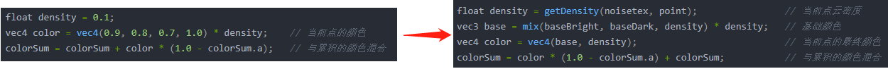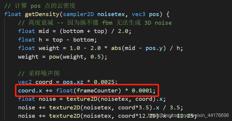 vec4 cloud = getCloud(noisetex, worldPos, cameraPos, lightPos); // 云颜色