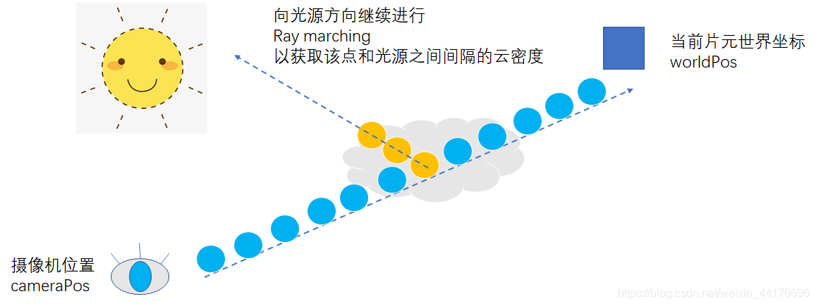 渲染体积云的思路十分简单:在片元着色器中,我们负责对场景的每一个像素进行上色。如果一个像素被云遮挡,那么我们应该把它涂上云的颜色。如图描述了体积云的渲染流程:
