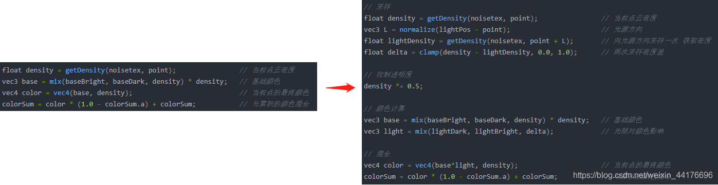 两条光线穿越厚度不同的云层,于是累积了不同的云密度。我们根据积累的密度,将云层的颜色和背景的颜色进行混合(时刻记得在任何 “体积” 特效中,我们都是针对背景的像素进行着色!),这里需要用到透明混合的技巧。