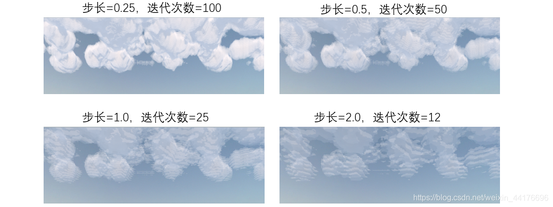 解决方案也很简单,使用 随机步长进行采样 即可。随机数从噪声图中获取即可。值得注意的是,随机步长会带来噪点,可以通过后处理阶段对体积云进行一次高斯模糊进行解决。